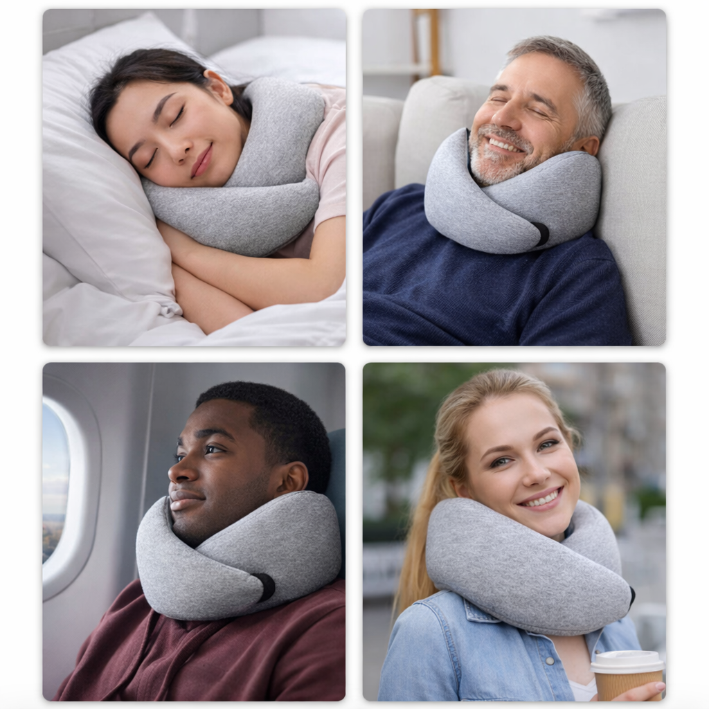 La Almohada Cervical 360° está diseñada para mantener tu cuello en la posición correcta y eliminar la tensión mientras viajas, trabajas o descansas.